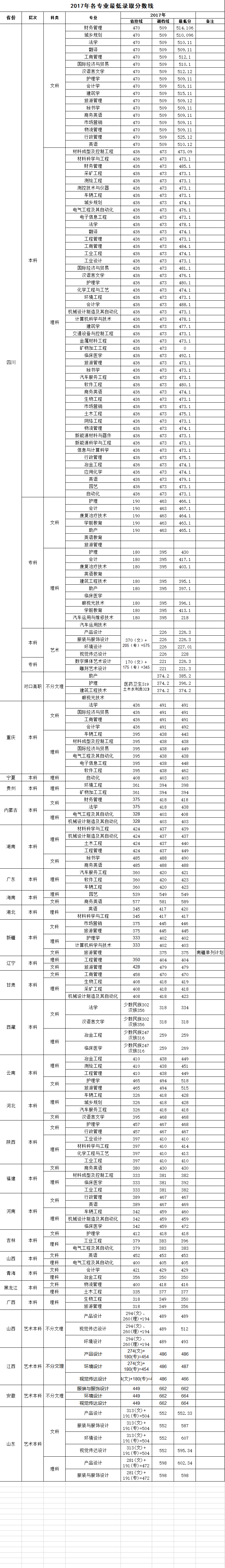 攀枝花学院2017年省内、省外各专业最低分