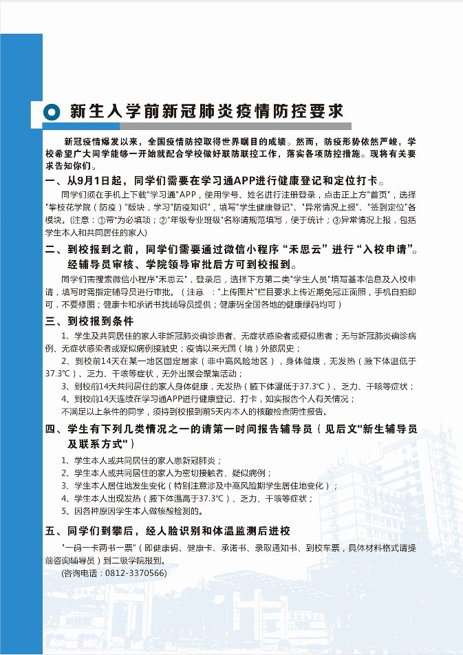 2020年攀枝花学院入学须知防疫事项,请学生和家长点击图片查看。