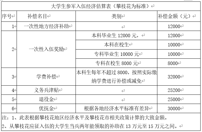 适龄青年服义务兵役享受的经济实惠有:(1)义务兵在部队享有津贴费,2年共约2.52万元,艰苦地区和特殊军兵种单位另有提高;(2)退役时部队发放退役金及相关补助,约1.27万元;(3)地方政府发放家庭优待金,共发放2年,每年按不低于入伍地上年度农村人均纯收入标准发放,攀枝花市义务兵家庭优待金每年约1.65万元;(4)对退出现役的义务兵发给自主就业一次性经济补助,全省统一为1.2万元;(5)高校新生、在校生和毕业生服义务兵役,国家按本专科学生每人每年最高8000元、研究生每人每年最高12000元的实际学费数额予以学费补偿和国家助学贷款代偿;(6)大学生入伍享有一次性奖励,攀枝花市规定本、专科毕业生标准分别为12000、10000元,在校生本、专科标准分别为10000、8000元;(7)退役后部队接转地方社保机构的职业年金和养老保险分别约为2.1万元、3.5万元。据测算,大学本科毕业生入伍服两年义务兵役(以攀枝花相关政策为例),国家和军地各级给予的各类经济补助最高可达20万元。
