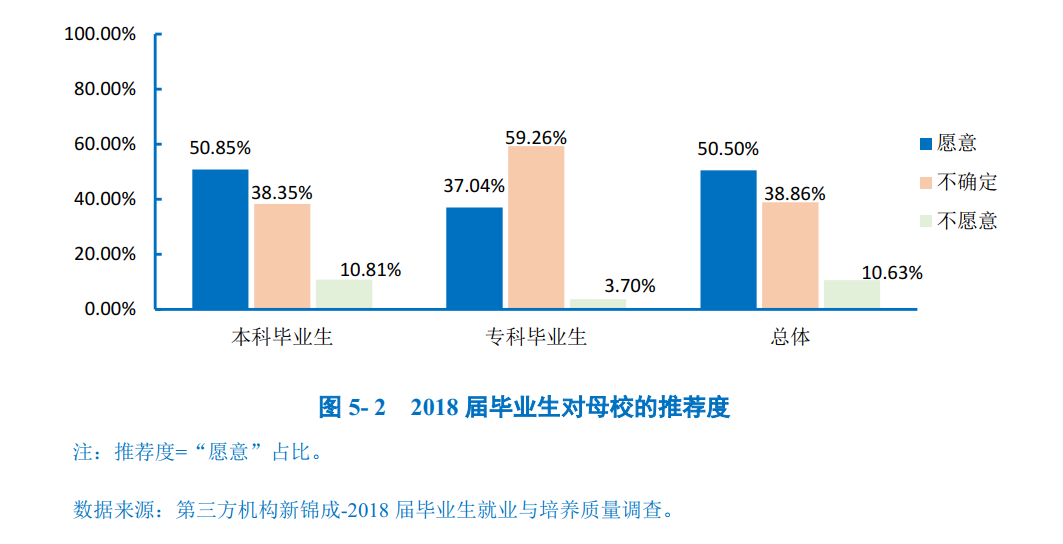 2018届毕业生整体上对母校的推荐度较高,50.50%的毕业生愿意向他人推荐自己的母校;38.86%的毕业生不确定是否向他人推荐母校;仅有10.63%的毕业生不愿意向他人推荐母校。其中,本科毕业生对母校的推荐度为50.85%,专科毕业生对母校的推荐度为37.04%。