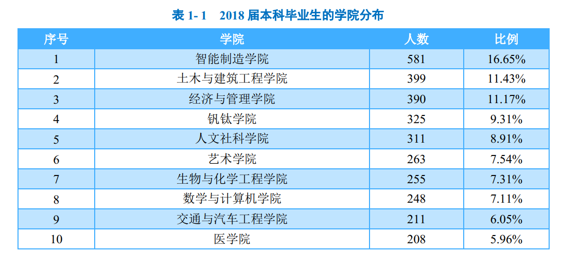 学校2018届本科毕业生分布在12个学院, 其中智能制造学院、 土木与建筑工