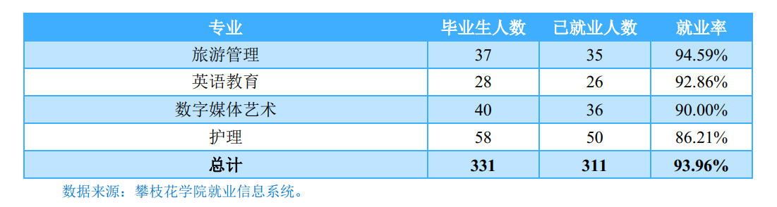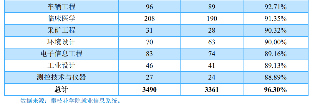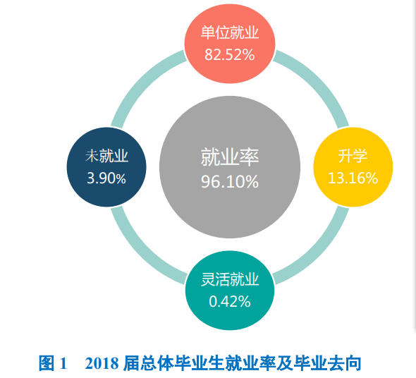 攀枝花学院2018届毕业生中超九成毕业生实现就业,就业率为96.10%。毕业去向分布详见下图。