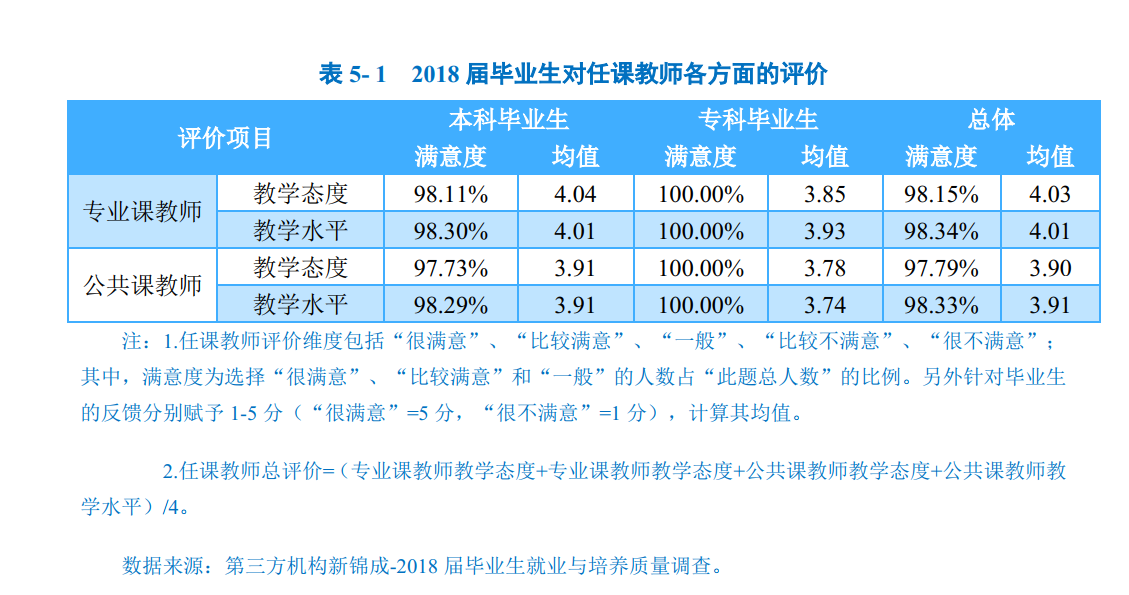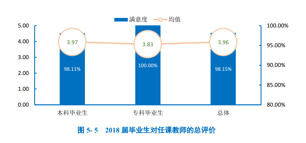 总体满意度评价:2018届毕业生对学校教师评价的综合得分为3.96分,处于“比较满意”水平;各学历毕业生对母校任课教师的满意度均处于98.00%以上,均值均在3.90分以上(5分制),处于“比较满意”水平。