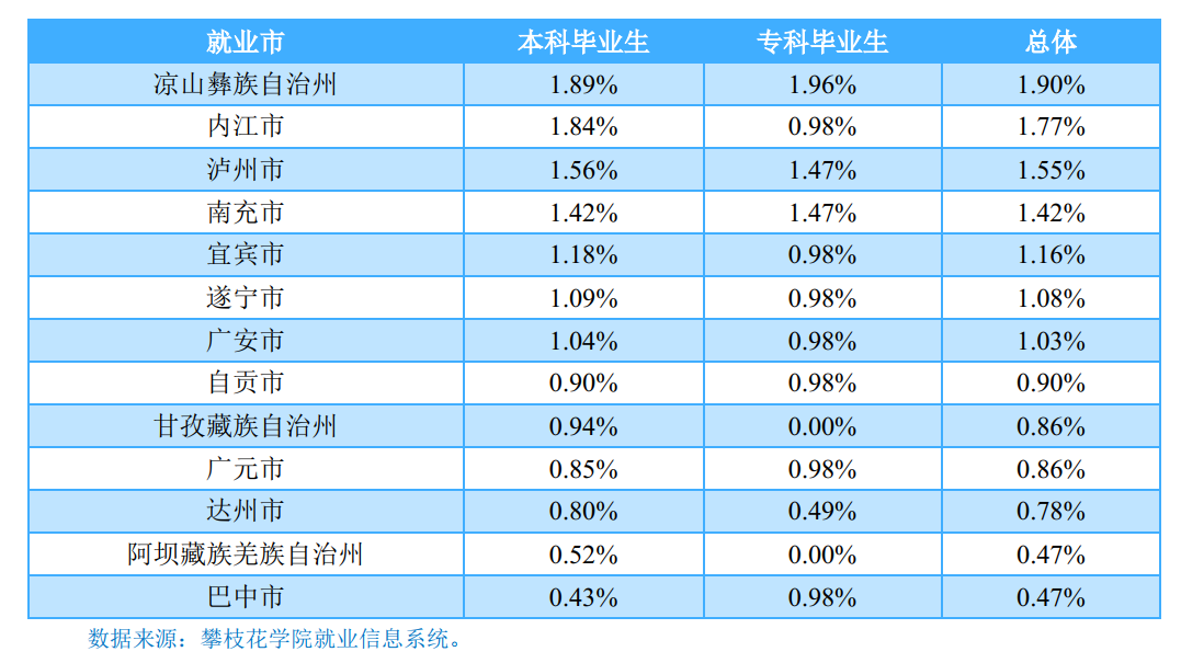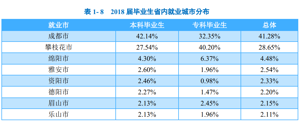 省内就业城市:四川省内就业的毕业生主要流向了成都市(41.28%)和攀枝花市(28.65%);其中,本科毕业生流向成都市(42.14%)的占比相对较高;专科毕业生则主要流向了攀枝花市(40.20%)。