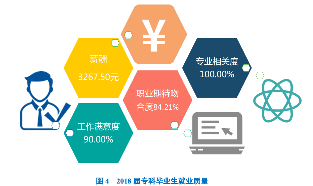 学校2018届专科毕业生税前月均收入为3267.50元,工作满意度为90.00%,专业相关度为100.00%,职业期待吻合度为84.21%。