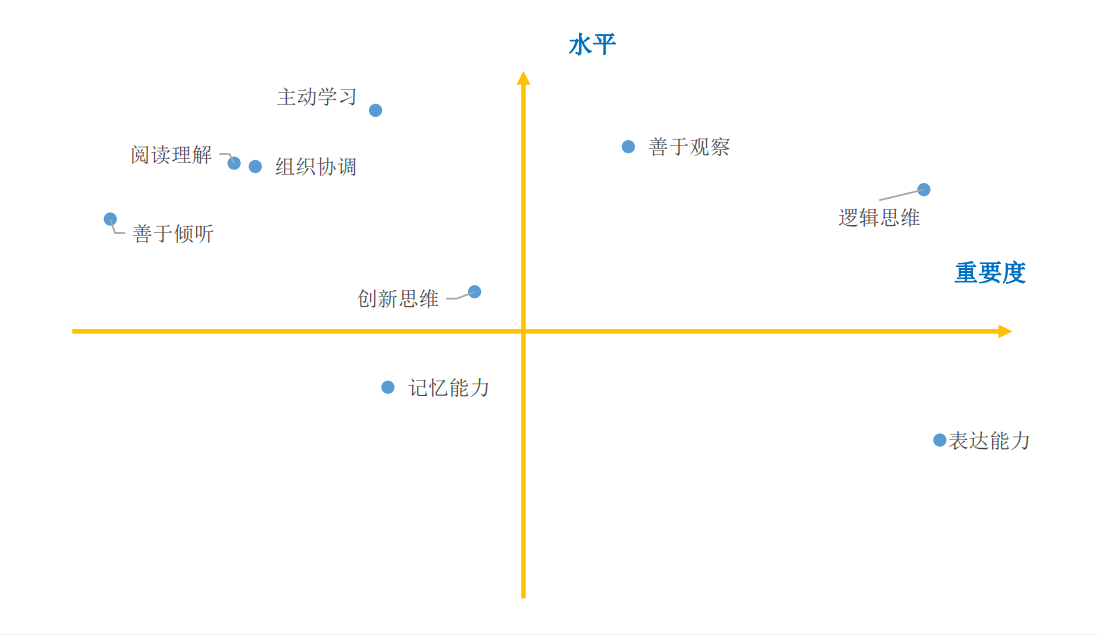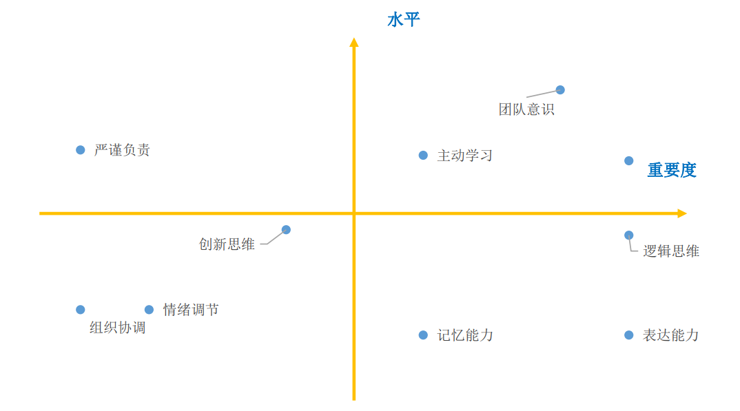 队意识、创新思维、记忆能力、主动学习、组织协调、阅读理解和善于倾听;而自身这十项基础能力素质的水平除了“表达能力”外均在3.00分及以上;其中“团队意识”的水平相对较高,均值为4.21分。