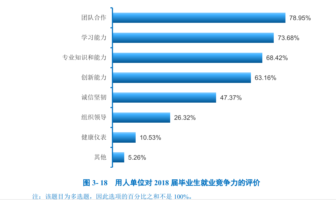对基础能力素质的评价:对于目前工作需求而言,学校2018届本科毕业生认为重要性排名前十位的基础能力素质依次为:表达能力、逻辑思维、善于观察、团