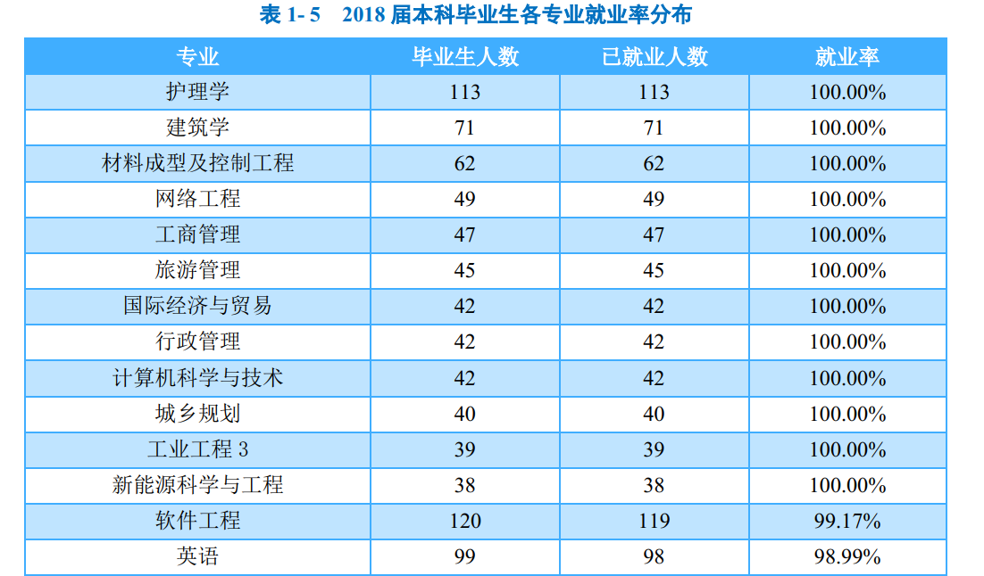 本科毕业生:学校2018届本科毕业生分布在49个专业,有46个专业的就业率均处于90.00%及以上;其中护理学、建筑学、材料成型及控制工程等12个专业就业率达到100.00%,实现了完全就业。