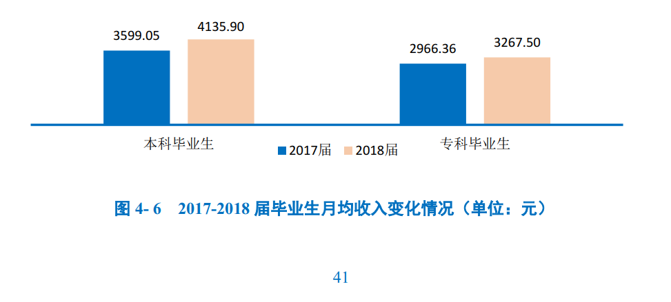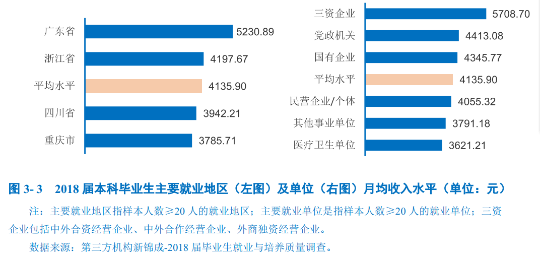 主要就业地区及单位月均收入:在广东省就业的本科毕业生当前月均收入水平相对较高,为5230.89元;而在重庆市就业的本科毕业生当前月均收入水平相对较低为3785.71元。在“三资企业”就业的本科毕业生薪酬优势较高,月均收入为5708.70元;而在“医疗卫生单位”就业的本科毕业生月均收入水平相对较低,为3621.21元。