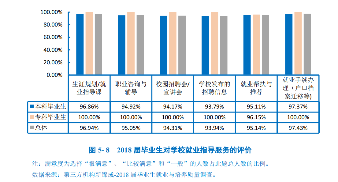 学校2018届毕业生对学校各项就业指导服务的满意度均在93.00%以上;其中对“就业手续办理(户口档案迁移等)(97.43%)”、“生涯规划/就业指导课”(96.94%)和“就业帮扶与推荐”(95.14%)的满意度相对较高。