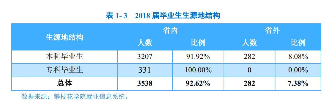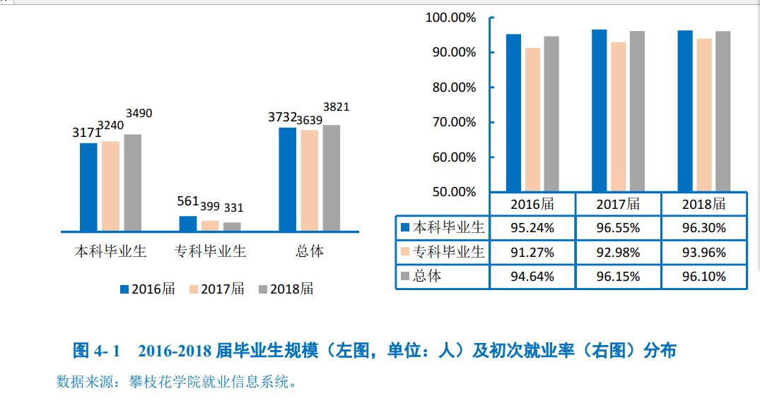 攀枝花学院2018届毕业生共3821人,其中本科毕业生3490人,占毕业生总人数的91.34%;专科毕业生331人,占毕业生总人数的8.66%。