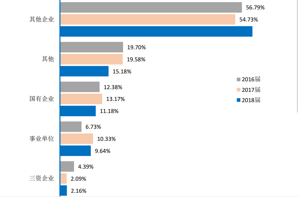 其他企业(主要为民营企业)为历届毕业生就业主战场,近三届占比均在54.00%以上,2018届毕业生在其他企业(主要为民营企业)就业的占比达到60.08%,与2017届相比提高5.35个百分点。另外,近三届毕业生在国有企业就业占比均在11.00%以上。一方面,这与我国近年来在就创业方面的扶持政策密切相关,产生了更为多元化的就业市场;另一方面也得益于学校紧跟市场需求调整就业导向,深化校政企合作,主动与重点企事业单位联络,构建合作新模式,为毕业生拓宽了就业渠道、提供了就业机会。