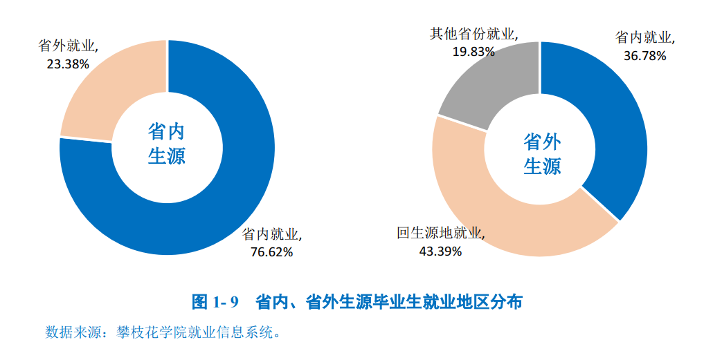生源地与就业地域交叉分析:省内生源中,76.62%选择留在本省(四川省)工作;36.78%的省外生源也优先考虑在四川省就业,43.39%的省外生源回生源地就业。