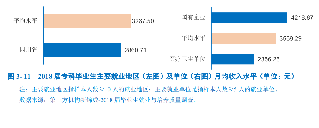 主要就业地区及单位月均收入:在四川省就业的专科毕业生当前月均收入为2860.71元。在“国有企业”就业的专科毕业生薪酬优势较高,月均收入为4216.67元;而在“医疗卫生单位”就业的专科毕业生月均收入水平相对较低,为2356.25元。