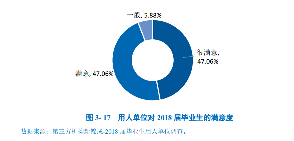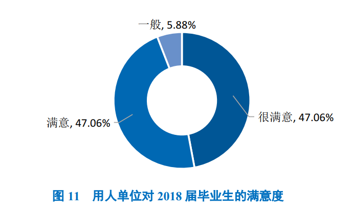 用人单位对毕业生满意度:94.12%的用人单位对学校毕业生的工作表现感到很满意或很满意;其中评价为“满意”和“很满意”的占比相同,均为47.06%。