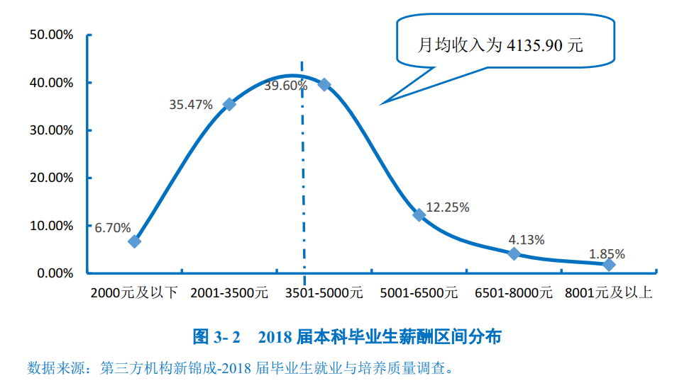 薪酬区间:学校2018届本科毕业生月均收入相对较高,为4135.90元;其中39.60%的本科毕业生月均收入在3501-5000元区间内,35.47%的本科毕业生月均收入在2001-3500元之间。