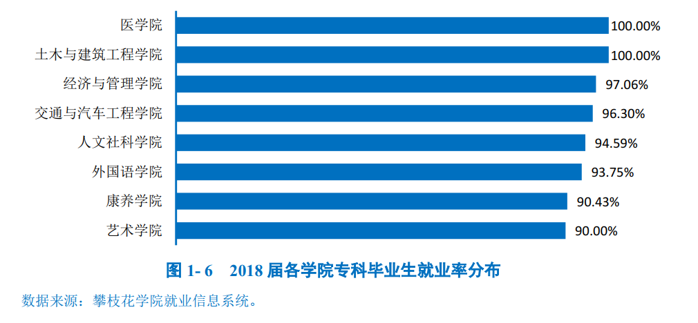 本科毕业生:学校2018届本科毕业生分布在12个学院,其中康养学院(100.00%)、数学与计算机学院(99.19%)、土木与建筑工程学院(99.00%)本科毕业生就业率位居前三。