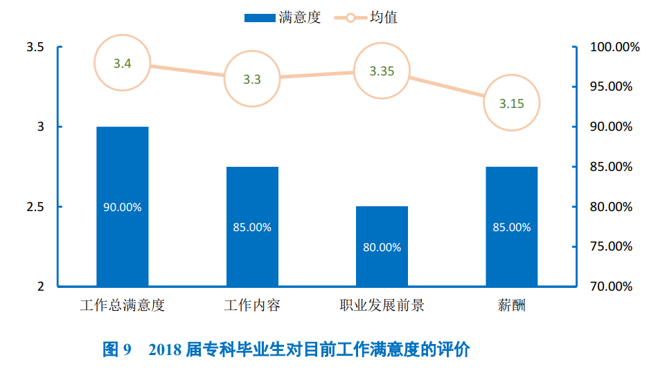 学校2018届本科毕业生对目前工作总的满意度为87.50%,处于较高水平;其中对工作内容的满意度最高,为89.68%。均值均处于3.05分及以上(5分制)。专科毕业生对目前工作总体的满意度为90.00%,处于较高水平;其次对工作内容及薪酬的满意度最高,均为85.00%。从均值来看,均处于3.15分及以上(5分制)。