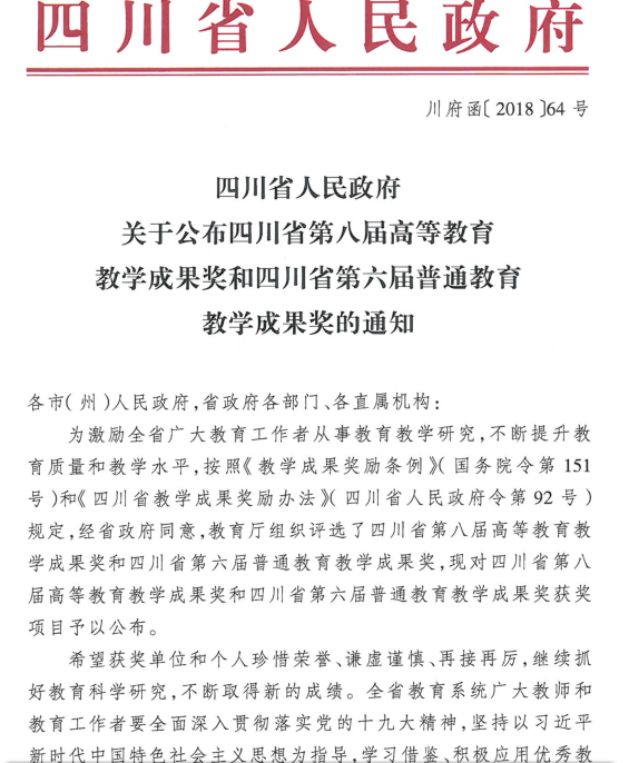 据悉,四川省高等教育教学成果奖代表了全省教学成果的最高水平,此次评选,共评出省级教学成果奖380项,其中一等奖100项,二等奖120项,三等奖160项。