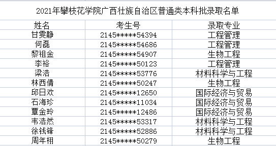 我校广西省本科二批录取圆满结束: 本科二批计划招收12人,文史3人,最高分476.97, 最低分472.97,平均分474.30;理工9人,最高分447.93, 最低分421.91,平均分428.80。具体录取名单如下: