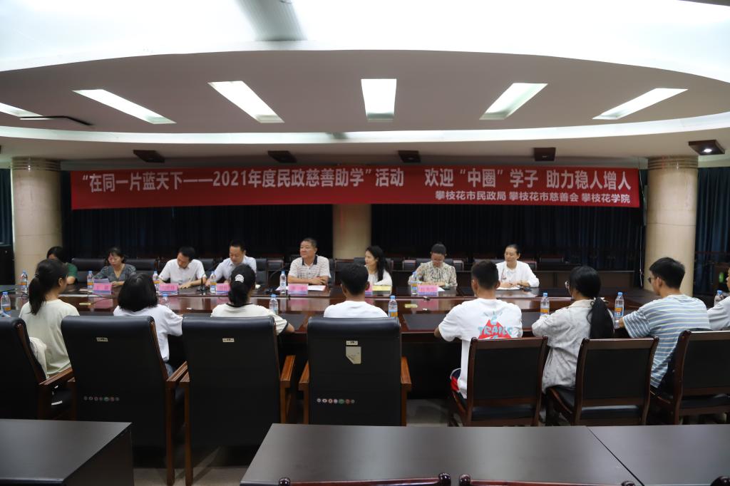 9月13日下午,攀枝花市民政局、攀枝花市慈善会在我校开展了“在同一片蓝天下——2021年度民政慈善助学”活动暨“中圈”学子助学金发放仪式。攀枝花市民政局党组成员、副局长、市慈善会会长蒲宏、攀枝花市慈善会副会长吴瑜、攀枝花市慈善会秘书长伍秀兰,学工部负责人及相关负责人,学校13名受助学生参加发放仪式。